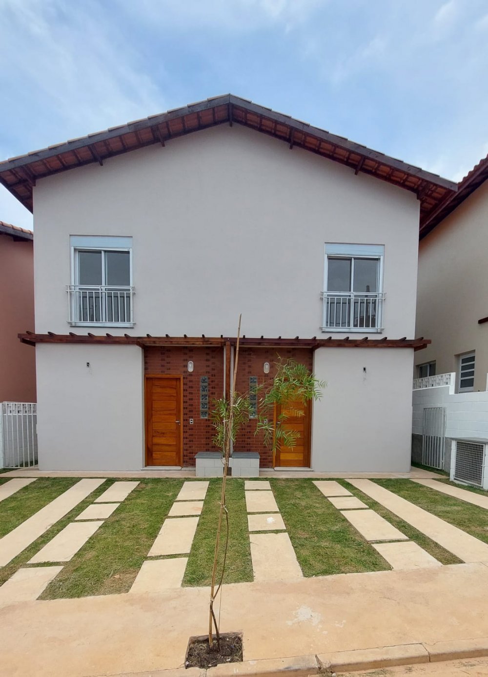 Nossos sobrados semi-isolados são projetados para atender às necessidades da vida moderna. Com sala integrada ao quintal e entrada de serviço independente, você tem flexibilidade para organizar o espaço de acordo com as suas preferências. Além disso, nossas casas são entregues com pergolado de madeira na fachada, ponto de TV nos 2 dormitórios, porta balcão no dormitório de casal, segundo dormitório com duas janelas com persianas.
